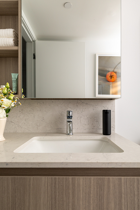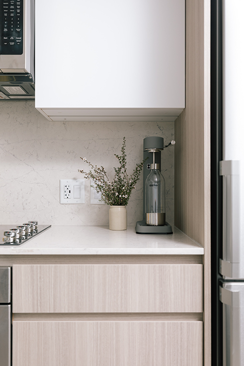 Interiors are designed with a light oak colour palette and include premium quartz countertops.